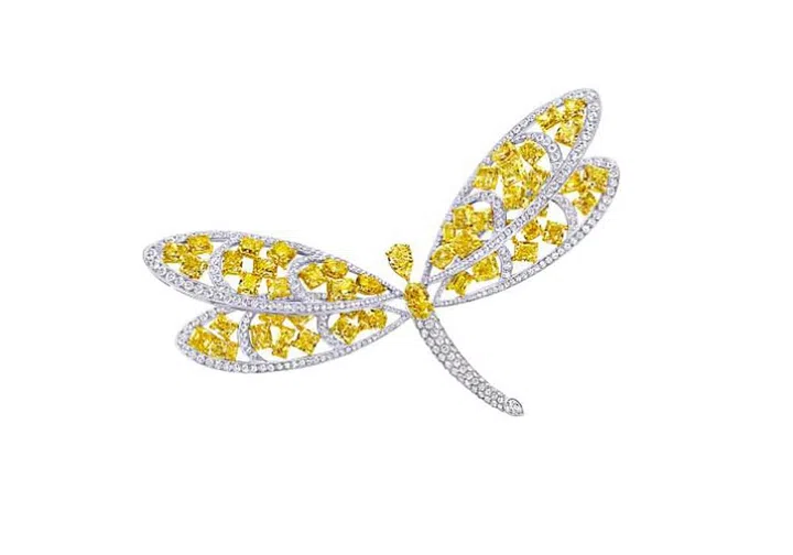 格拉夫(Graff)擅长以大自然为题材,打造精致不凡的珠宝作品。一只以格拉夫著名黄钻所打造的璀璨蜻蜓胸针,绝佳的诠释出众的美学视角精湛工艺。格拉夫的资深设计团队以钻石勾勒出蜻蜓的外形,中央镶嵌一颗2.55克拉的艳彩黄钻,双翼在光线下轻轻颤动,犹如蜻蜓飞翔时翅膀映照出的太阳光芒。