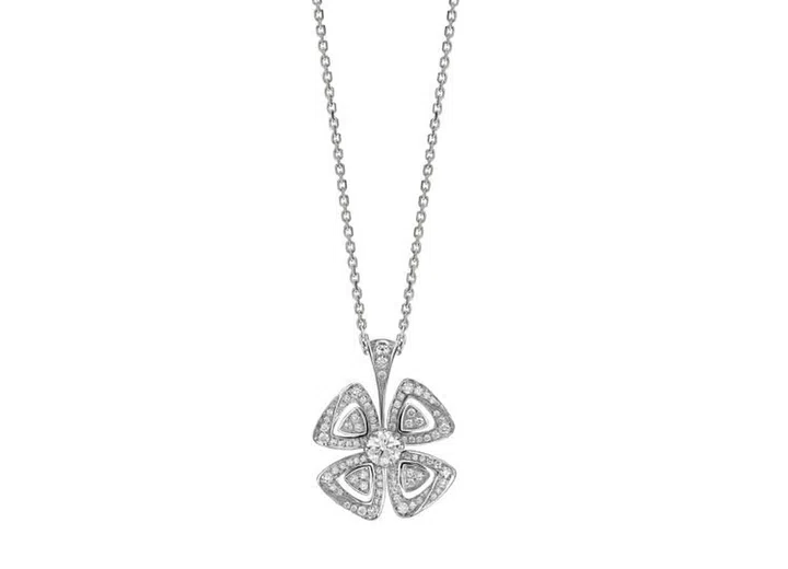 最新系列的Fiorever 的自由奔放的能量象征,透过四瓣花朵的形态,闪烁着最高品质的钻石(颜色D-F,透明度IF-VVS)。 钻石中心是一颗0.10克拉至0.50克拉价值珍贵的单粒宝石,在宝石周围,每朵精致的花瓣设计向上倾斜,展示出宝格丽立体的设计风格。