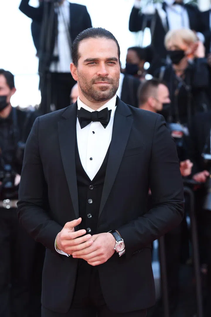 William Abadie佩戴萧邦(Chopard)Alpine Eagle 玫瑰金腕表,Caroline Scheufele佩戴萧邦Red Carpet系列18K白金镶嵌祖母绿与钻石项链。