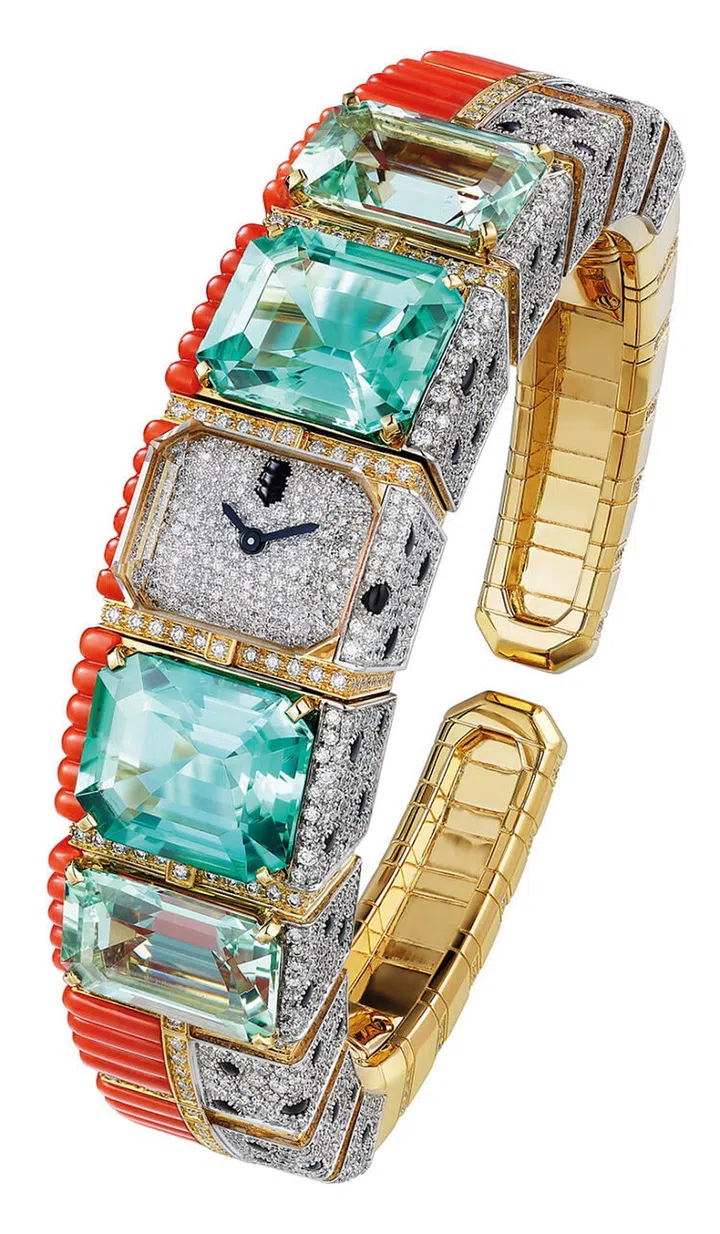 Panthere Tropicale腕表,18K黄金,海蓝宝石,蓝色碧玺,珊瑚,缟玛瑙,钻石,石英机芯。