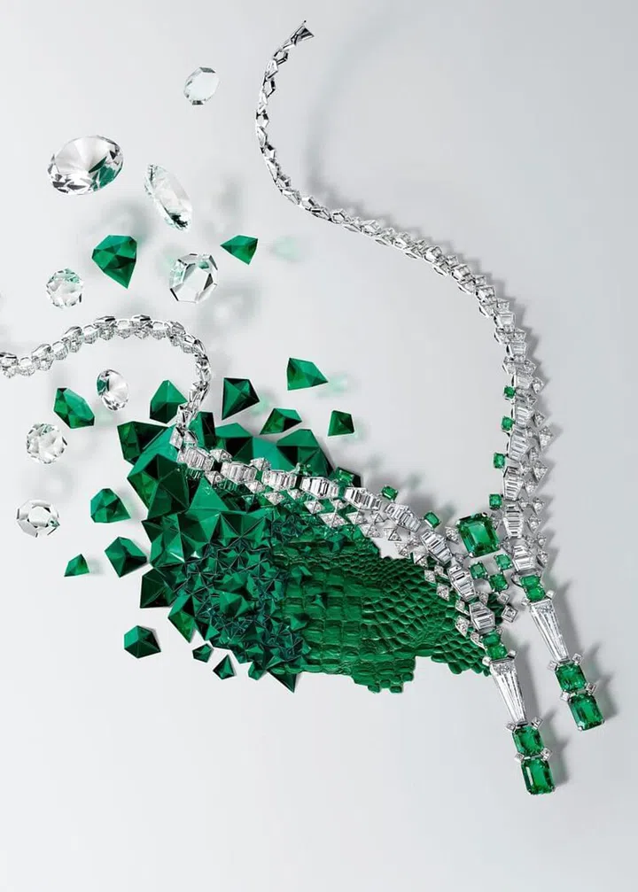 卡地亚[Sur]Naturel高级珠宝系列Gharial项链,铂金,祖母绿、钻石。