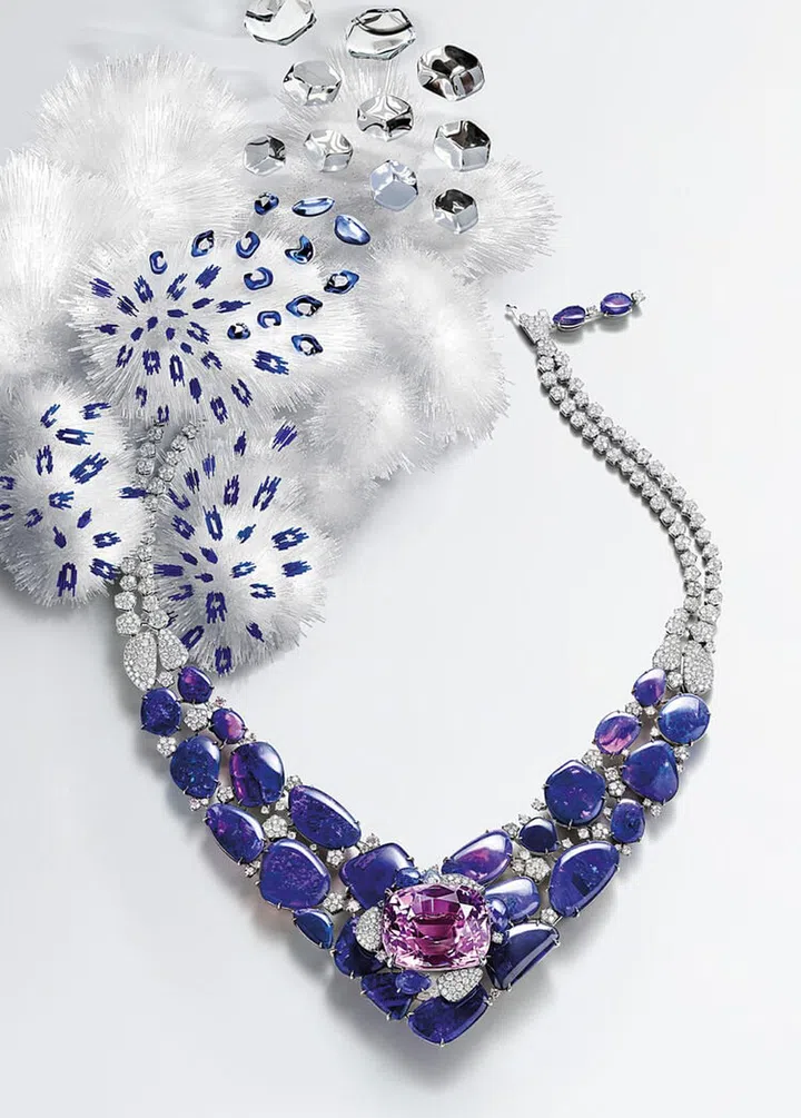 卡地亚[Sur]Naturel高级珠宝系列Hemis项链,铂金,紫锂辉石、欧泊、粉色和白色钻石。