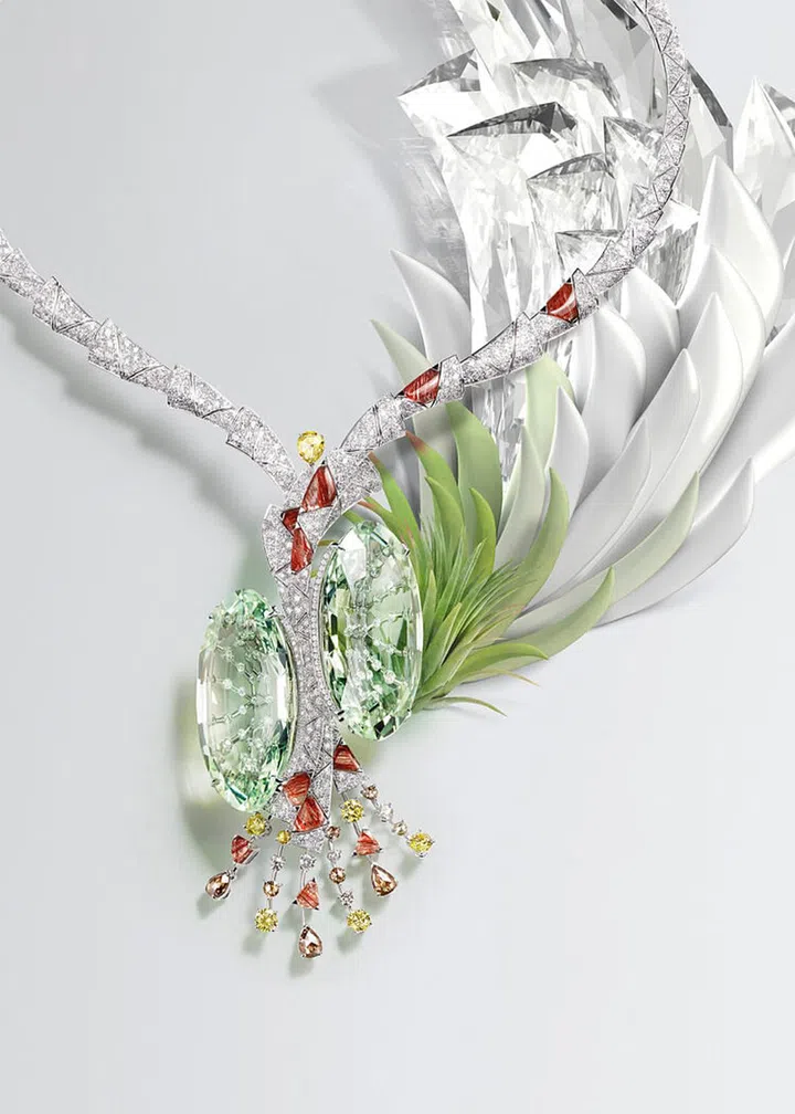 卡地亚[Sur]Naturel高级珠宝系列Tillandsia项链,18K白金,绿柱石,黄色钻石,橙粽色钻石,发晶,粽色钻石,白色钻石。