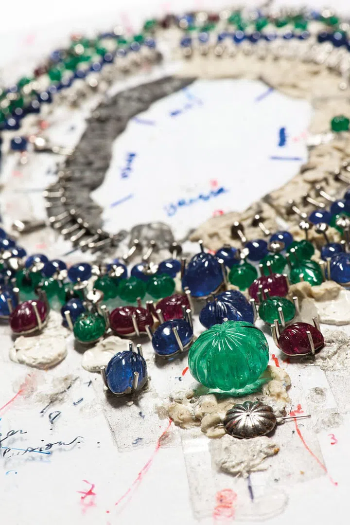 由Tutti Frutti变身而来的项链,以雕刻祖母绿、雕刻蓝宝石与红宝石,在翡翠珠粒与明亮切割钻石衬托下,流淌着涌动的生命力。