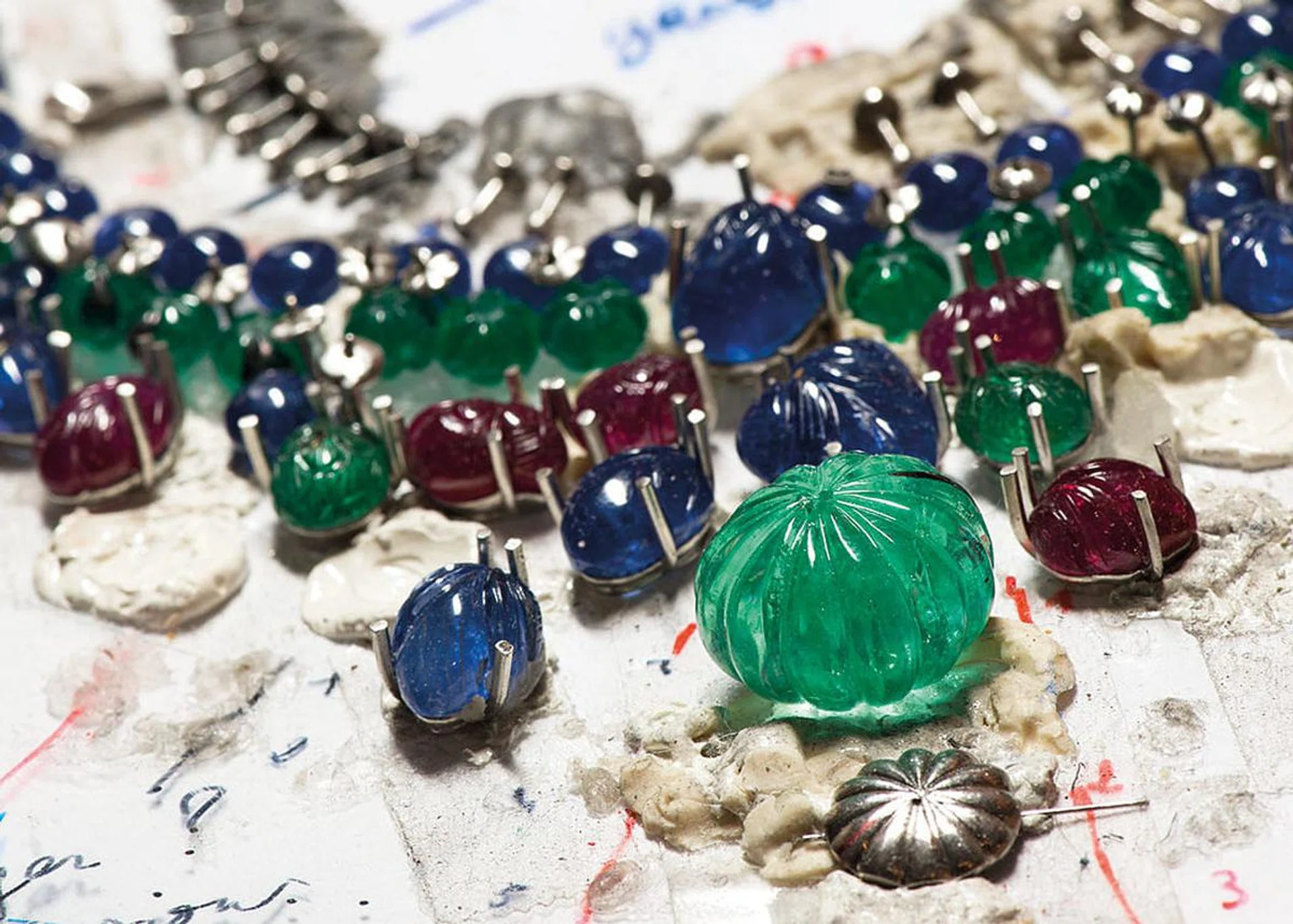 当中最受瞩目的当属一款由Tutti Frutti变身而来的项链,以雕刻祖母绿、雕刻蓝宝石与红宝石,在翡翠珠粒与明亮切割钻石衬托下,从孕育生命之源的大自然汲取创意灵感,让设计流淌着涌动的生命力。