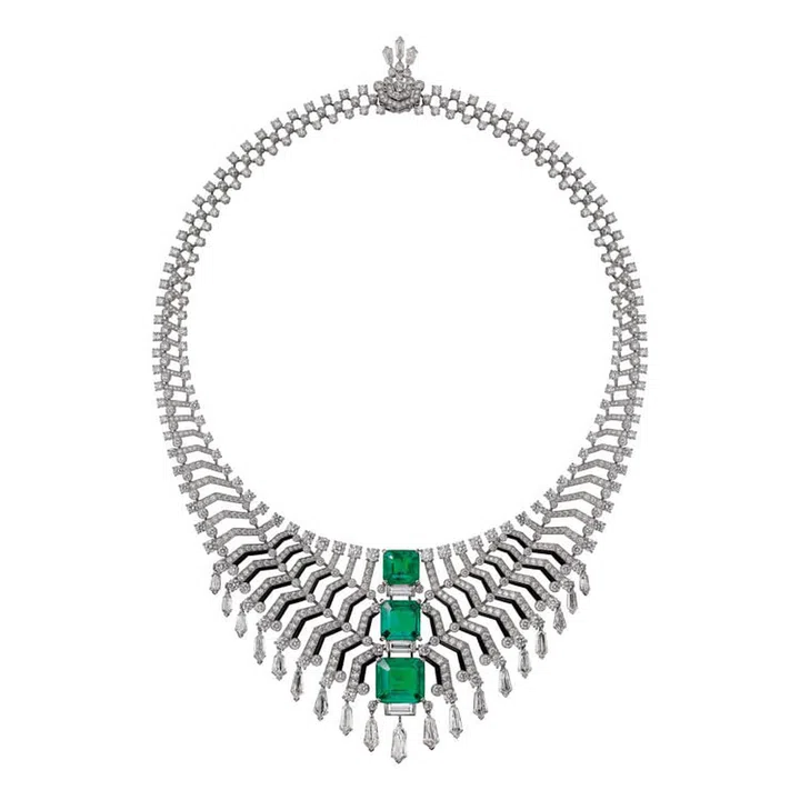 另一款名为Oracle的祖母绿项链,3颗阶梯式圆角切割祖母绿,每颗颜色饱和度完美一致,突显整体作品的强烈个性,搭配6颗阶梯式风筝形切割钻石,和圆形明亮切割钻石与缟玛瑙,设计的活力来自于绿色与黑色的对比效果, 正是卡地亚一百多年来的色彩组合象征。