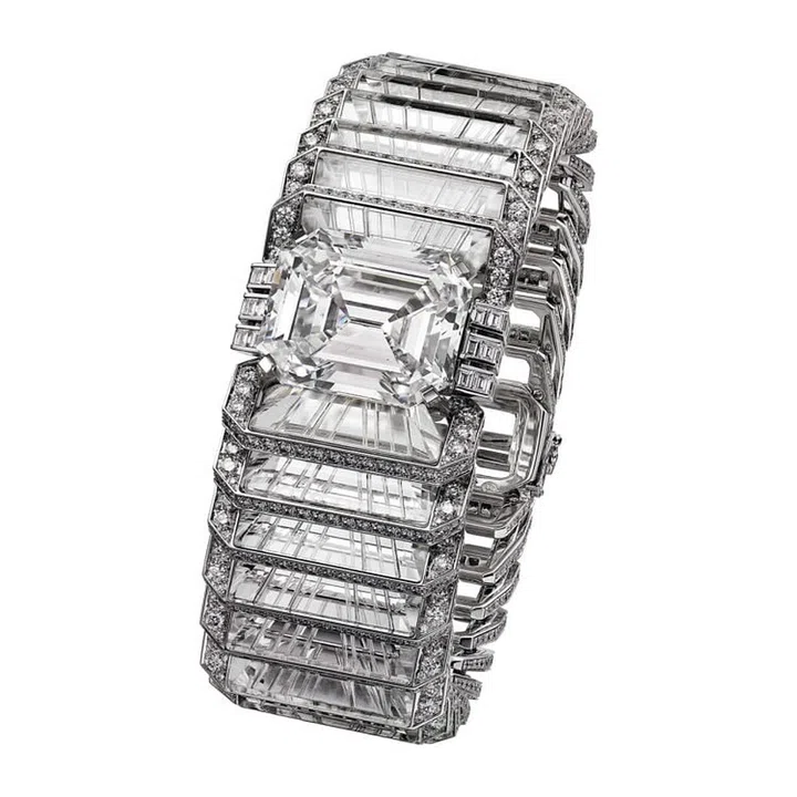 Illumination手镯:18K白金镶嵌一颗祖母绿形切割钻石,重达31.16克拉,能够置于戒指上佩戴或替换为铺镶钻石图案。