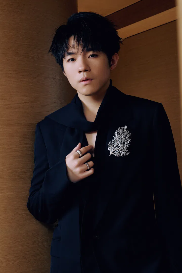 陈卓贤选择以宝诗龙白金镶嵌珊瑚和钻石胸针作为第43届香港电影金像奖红毯造型亮点。