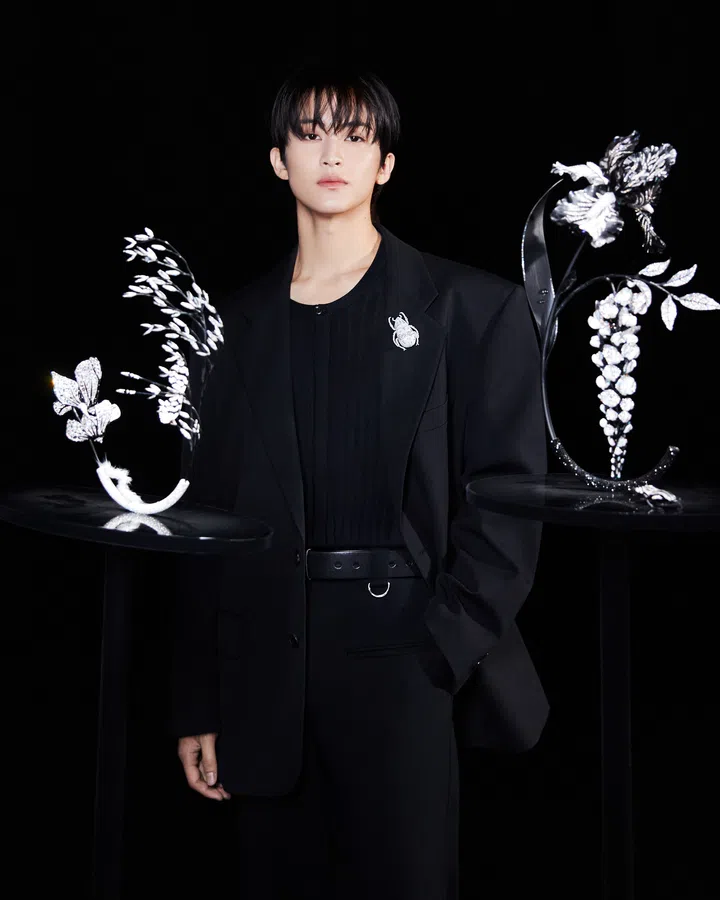韩国歌手Mark佩戴宝诗龙Carte Blanche: Impermanence 高级珠宝系列 Composition N°5 主题Rhinoceros Beetle胸针,作品采用白色陶瓷镀层与白金打造,镶嵌璀璨钻石,展现独特魅力与精湛工艺。