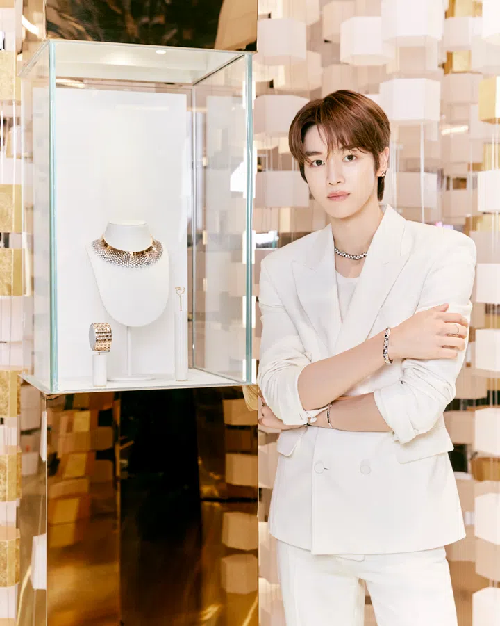 韩国人气男团RIIZE成员Sungchan选择佩戴Bee de Chaumet系列白金项链、手链与戒指,以及玫瑰金耳扣,于shan乐天世界塔快闪展览开幕活动展现青春时尚魅力。