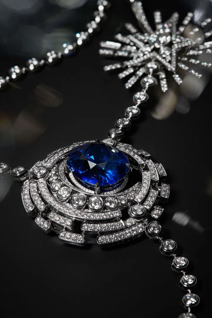 Allure Céleste项链是这一系列的巅峰之作,犹如一场奔赴光芒中心的旅程。在浩瀚广袤的天际中,繁星密布,彼此闪耀又相互连接,聚拢成万丈光芒。在圆形切割的钻石群簇拥下,镶嵌着一颗重达55.55克拉、深邃而浓郁的椭圆形蓝宝石,与一颗重达8.05克拉的IIa型DFL级梨形切割钻石,光芒四射,璀璨非凡。这款项链可转换多种佩戴方式,太阳的光晕可以被单独拆卸作为胸针,中央的一圈钻石则能够变换为手镯。项链还可以精简为短款,正如当年香奈儿女士希望的那样以星辰围绕着女性,向她在1932年的大胆创作致以最高的敬意。