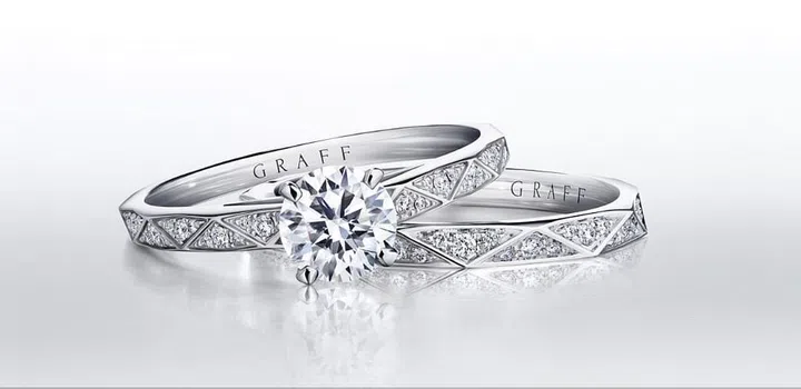 格拉夫(Graff)的婚嫁珠宝系列,每颗钻石均由格拉夫家族成员亲身挑选,其中最能代表 劳伦斯 • 格拉夫(Laurence Graff)先生的就属以他名字命名的)Laurence Graff Signature 系列,设计师将品牌经典的DNA融入设计中,以圆形明亮式钻石的切割琢面作为灵感, 几何琢面幻变成戒指环圈,是格拉夫的专属印记。