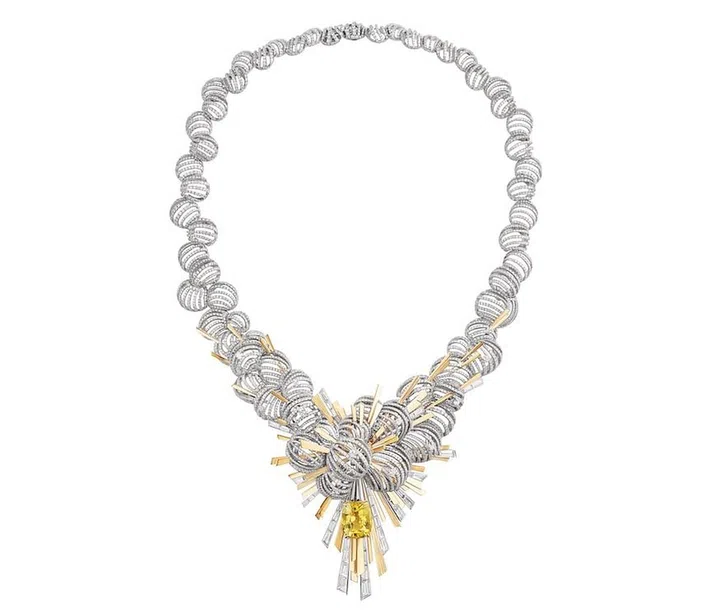 无数金色“浮云”串成的项链,镶嵌一颗22克拉和一颗18.88克拉的金黄色斯里兰卡蓝宝石。珠宝基座以Chaumet著名的传统金工技艺打造,金属经由削磨后报如蝉翼,为宝石覆上一层耀眼的网状金饰品。