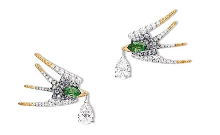 Envol飛燕造型白金与黄金耳坠,采用两颗总重1.31克拉的榄尖形切割非洲綠色沙弗萊石、两颗各重1.57克拉的梨形钻石、圆形黄色和绿色蓝宝石,以及明亮式切割钻石。似曾相识燕归来,燕子在中西文化里都有着期待和回归的好意头,这组Envol套饰堪称东西方两头讨好。