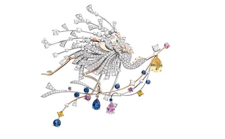 Parade仙鹤造型白金和玫瑰金胸针,镶嵌了斯里兰卡梨形黄色蓝宝石、方形切割黄色色蓝宝石、圆形黄色蓝宝石、马达加斯加梨形粉红蓝宝石、圆形粉红蓝宝石、斯里兰卡梨形蓝宝石、圆形蓝宝石,以及明亮式切割钻石。仙鹤飞翔,姿态灵动且华丽雍容,颇具东方意象。
