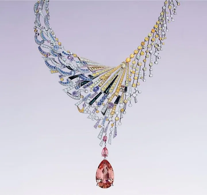 暴风雨来临前,天空的颜色变幻莫测,这条色彩绚烂的Lueurs d'Orage项链旨在表达这样的景观。蓝宝石、紫水晶和坦桑石色彩各异,却有互相辉映,像演奏一阙天空交响曲。项链中央镶嵌一颗重37.68克拉的帝王吐帕斯石,光华耀眼,而这颗主石可拆下用以搭配另一条简约的项链,也能夹着钻石胸针戴在胸前。