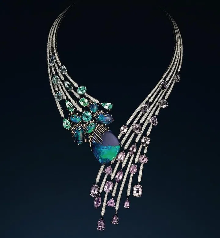 这款白金与玫瑰金项链,镶嵌六颗产自澳洲的黑色蛋白石,总重49.04克拉,另外还镶嵌一颗重4.34克拉的巴西椭圆形帕拉伊巴碧玺、31颗总重64.22克拉的各色莫桑比克巴拉伊巴碧玺,以及明亮式切割钻石。