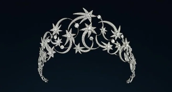 Etoile,法语星星的意思。Etoiles Etoiles珠宝套饰是对Chaumet在150多年前创造的天体主题珍宝所做的时尚演绎,这顶白金镶钻冠冕,星月争辉,光芒闪烁而温柔,戴上它的女子肯定会是晚宴上最亮眼的皇后。