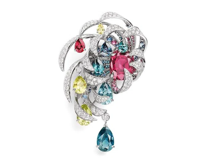 这款色彩斑斓的胸针,颜色的组合让人惊艳。设计师采用许多色彩缤纷的坦桑尼亚尖晶石和越南尖晶石,以蓝红绿黄四色“调和”成天空的丰富表情。全铰接式结构营造的动态,赋予宝石跃动的生命。