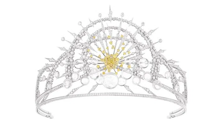 这顶冠冕的设计灵感源自天体之王——太阳,闪耀的黄钻如同金黄的日头,在象征白云的纯净白钻中绽放光芒;工匠以精湛和特殊的刀锋镶嵌工艺,让冠冕的光芒仿佛悬浮于空中。这件精品是一首对光明的颂歌。