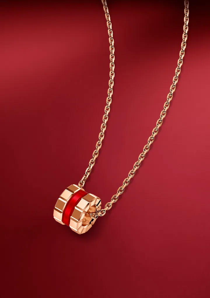 新作项链的吊坠悬垂于一条由品牌工坊精心打造的链条之上,灵动捕捉璀璨光影。另一款新作则以柔韧丝滑的绳带织就红绳造型,赋予其舒适质感,既可点亮节日欢庆,亦能满载炽热希冀,于璨然新春点睛时刻优雅。