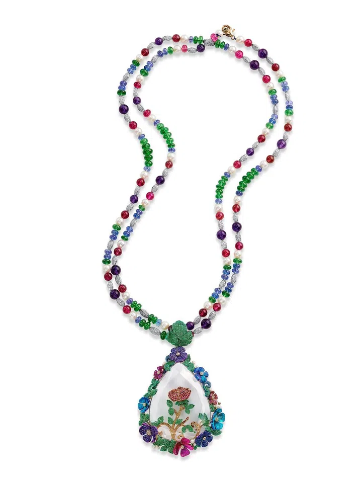 一条色彩缤纷的长项链饰有极富创意的吊坠,谱写对植物的诗意颂歌。水晶天然纯净,无任何内含物,中心绽放着一朵由红色调碧玺、沙弗莱石和彩色钻石组成的花卉。水晶周围环绕九朵以手工打造的钛金属花卉。项链尽显精致细节,花蕊以微镶钻石点缀,加强了每朵花的独特性,将每朵花独一无二、栩栩如生的面貌呈现得淋漓尽致。这件宛如微雕般的作品点缀形似露水的小珍珠,让人联想到在清晨时凝结于沙弗莱石叶片上的露珠。