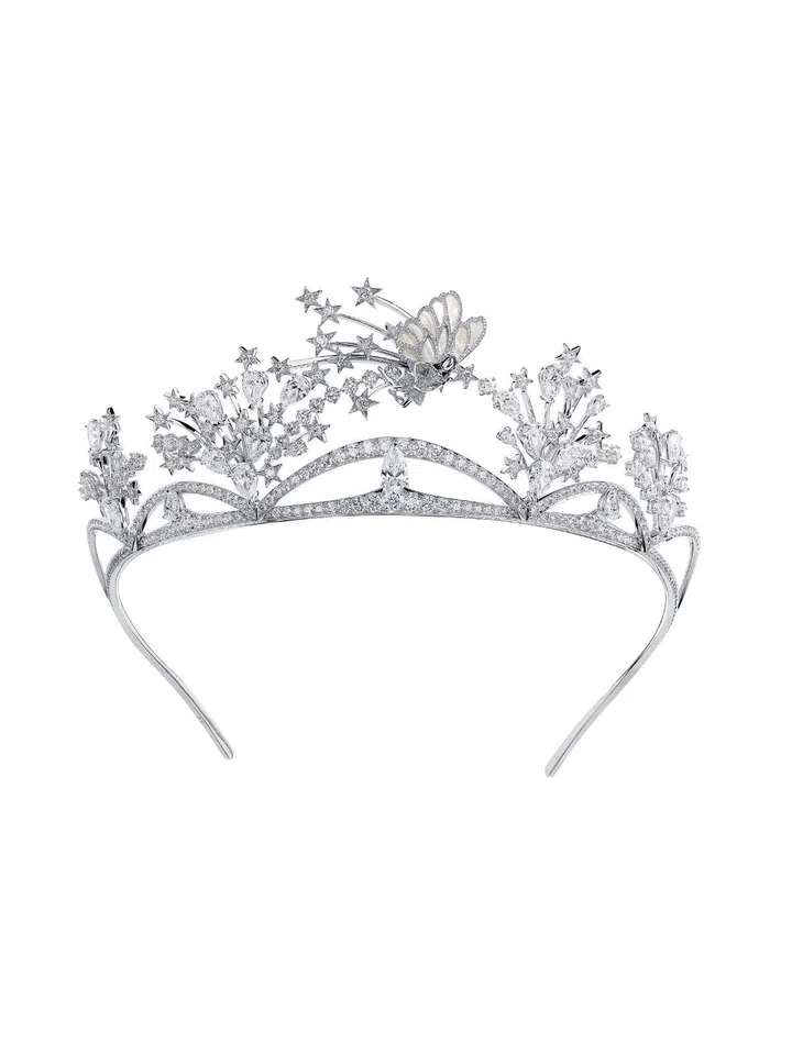最后登场的这位角色与童话故事的世界紧密扣连,人们相信她被赋予超自然力量。她位于一顶梦幻无瑕的冠冕中央,身边环绕着一颗颗如雨般洒落的星星和水滴形钻石。她便是轻灵的仙女,展开由珍珠贝母打造的翅膀,仙气飘逸,优雅脱俗。只要轻轻挥动魔杖,作品随即化成一枚胸针,触手可及的秘密只在轻声低语中向仙女透露。