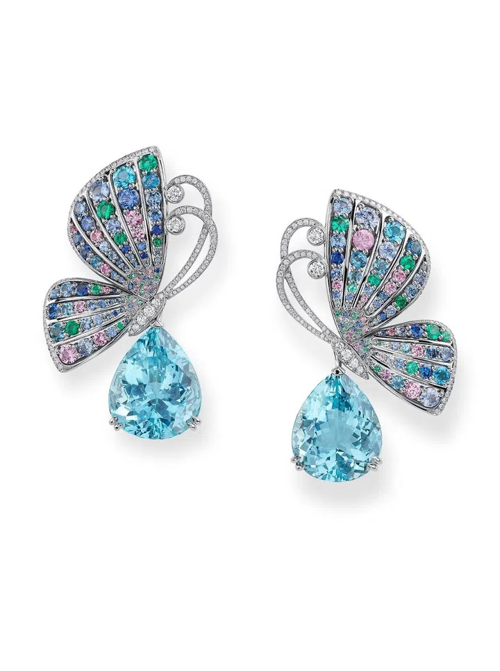 一对蝴蝶造型耳环,由符合萧邦可持续发展和社会责任理念的白金打造而成。象征着自在无忧的两只蝴蝶于两颗梨形切割海蓝宝石上翩然起舞,为花朵授粉,为生命播种,恰似自然界的艺术家,它们飞进引人入胜的童话故事中,虽然身影纤纤轻飘,却往往是非凡历险中的重要主角。