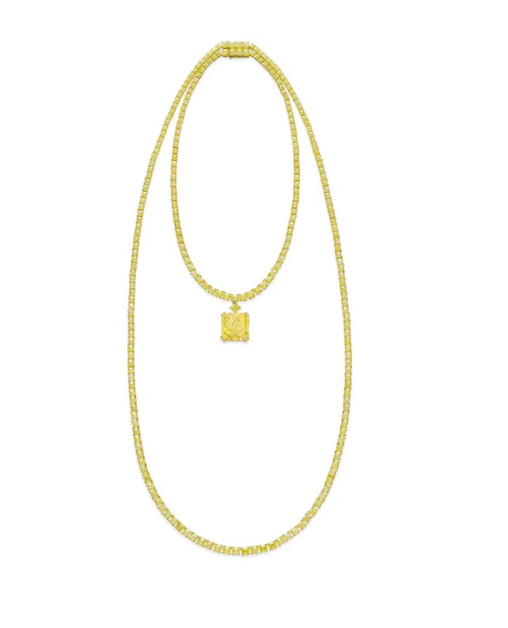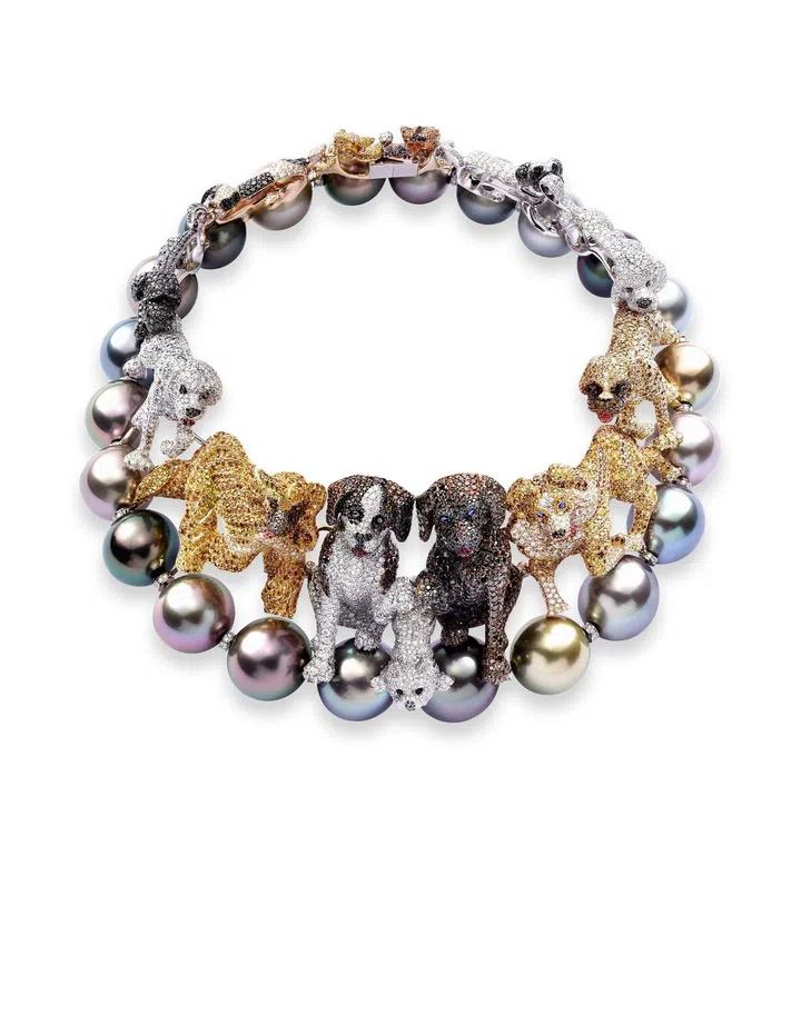 犬群项链采用符合伦理道德标准的18K白金和18K玫瑰金制作,镶嵌白色钻石、彩色钻石和27颗彩色圆形珍珠,加上钻石骨形扣环。由左至右出现的狗狗品种是纽芬兰犬、圣伯纳犬、阿富汗猎犬、边境牧羊犬、㹴犬、贵宾犬、威玛猎犬、拳师犬、雪纳瑞、查理士王小猎犬、八哥犬、约克夏犬、吉娃娃。