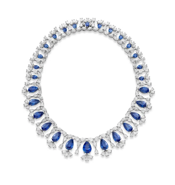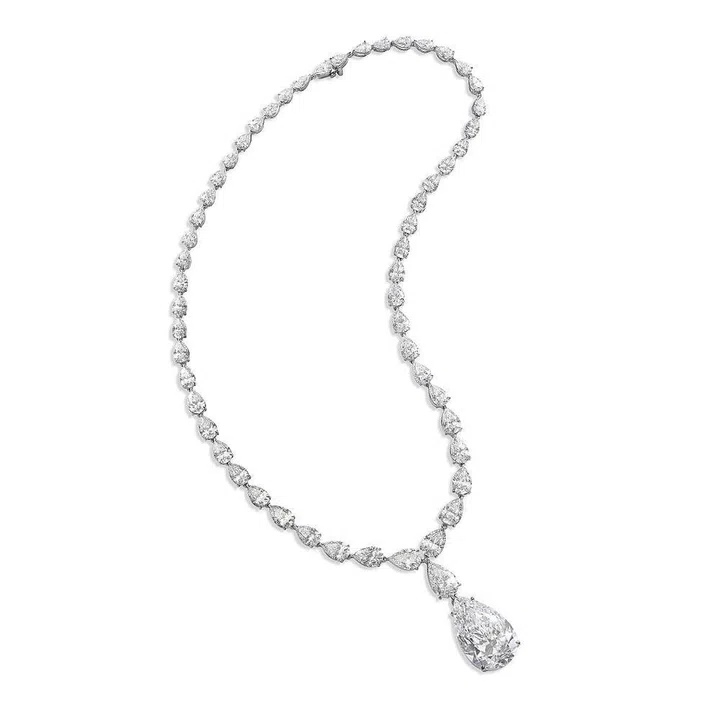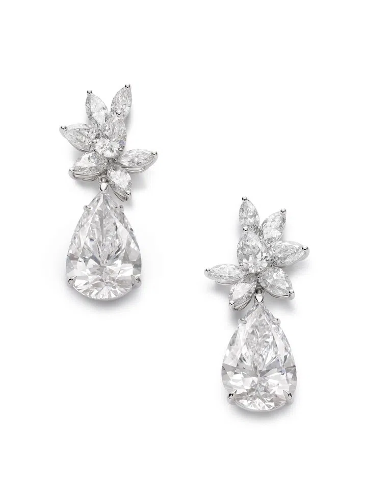 Red Carpet 白金耳坠,主石为2颗水滴形切割钻石,分别重9.03ct和8.77ct,达到 D 色和 Flawless 净度级别,为 Type IIa 型钻石,点缀水滴形和榄尖形切割钻石。