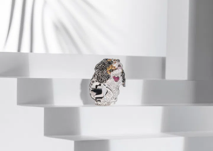 卡罗琳•舍费尔自幼在众多灵犬的陪伴下长大,这份与生俱来的灵性羁绊化作其非凡创作灵感之源。2010年,卡罗琳推出150件匠心之作——动物世界(Animal World)高级珠宝系列,礼赞萧邦150周年诞辰。十五载光阴流转,卡罗琳挚爱的骑士查理王小猎犬“拜伦”(Byron)——当属戛纳电影节红毯上备受宠爱的吉祥使者。如今,卡罗琳以其为原型设计了一款栩栩如生的戒指,镶嵌白色、黑色和香槟色美钻,其灵动之姿经萧邦精雕细琢跃然于指尖。