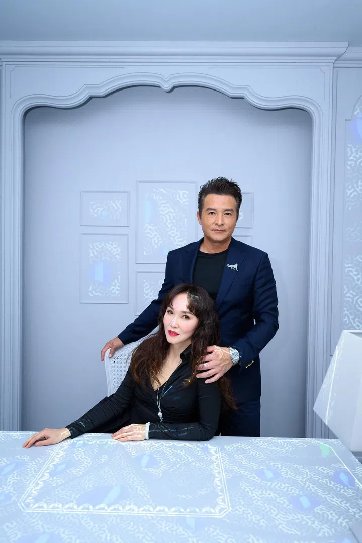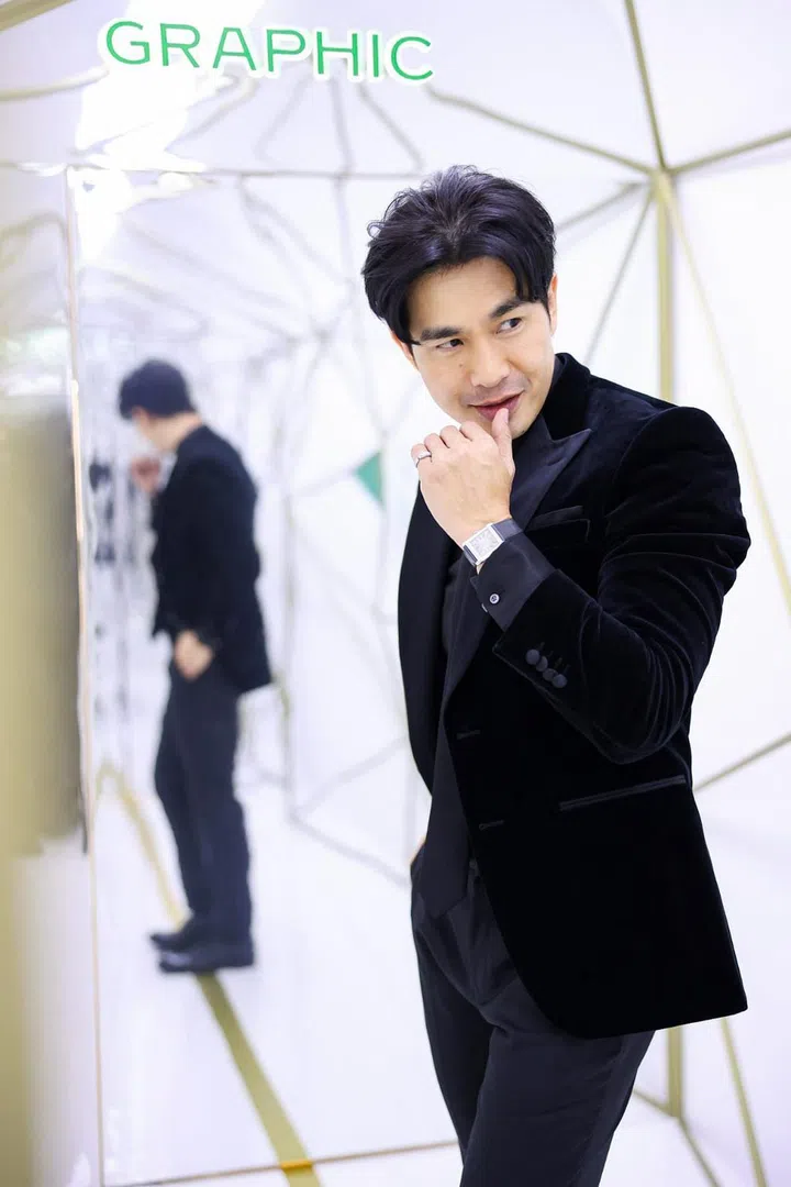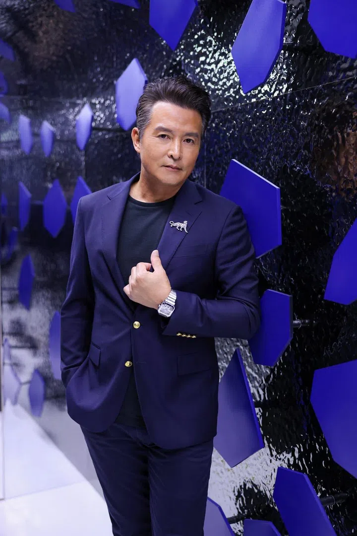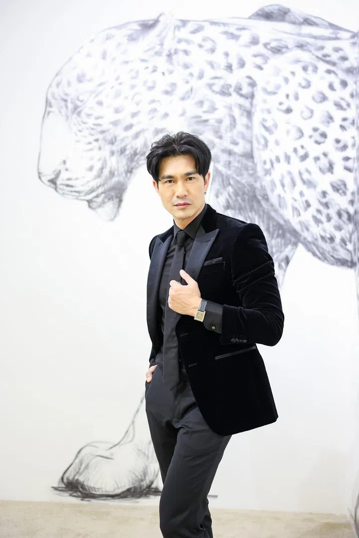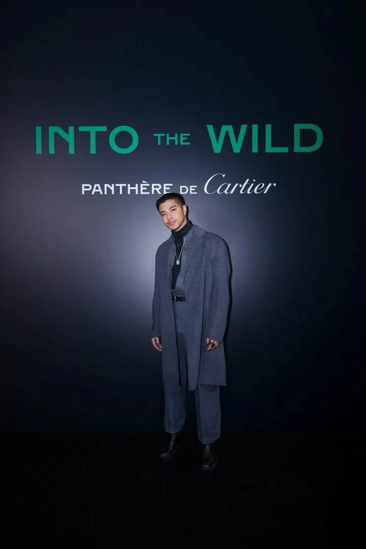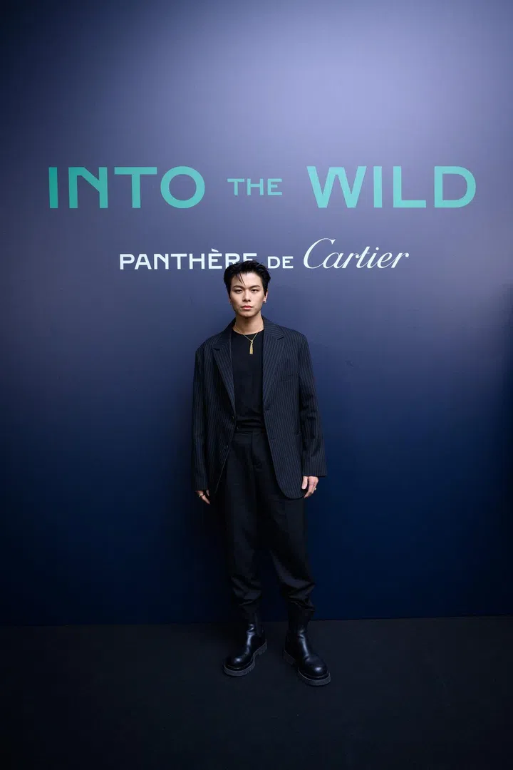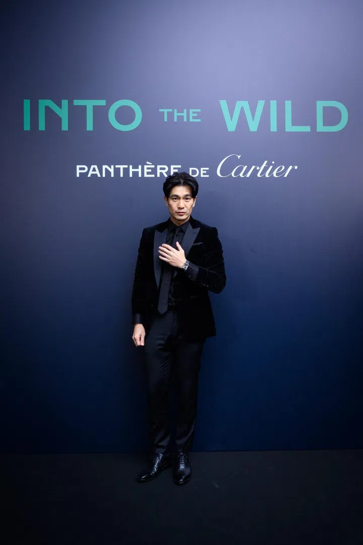 Benjamin Kheng佩戴Panthère de Cartier 白金镶嵌祖母绿、缟玛瑙和钻石项链及耳环、Panthère de Cartier白金镶嵌沙弗萊石和缟玛瑙戒指,搭配Panthère de Cartier精钢镶钻腕表小号表款。