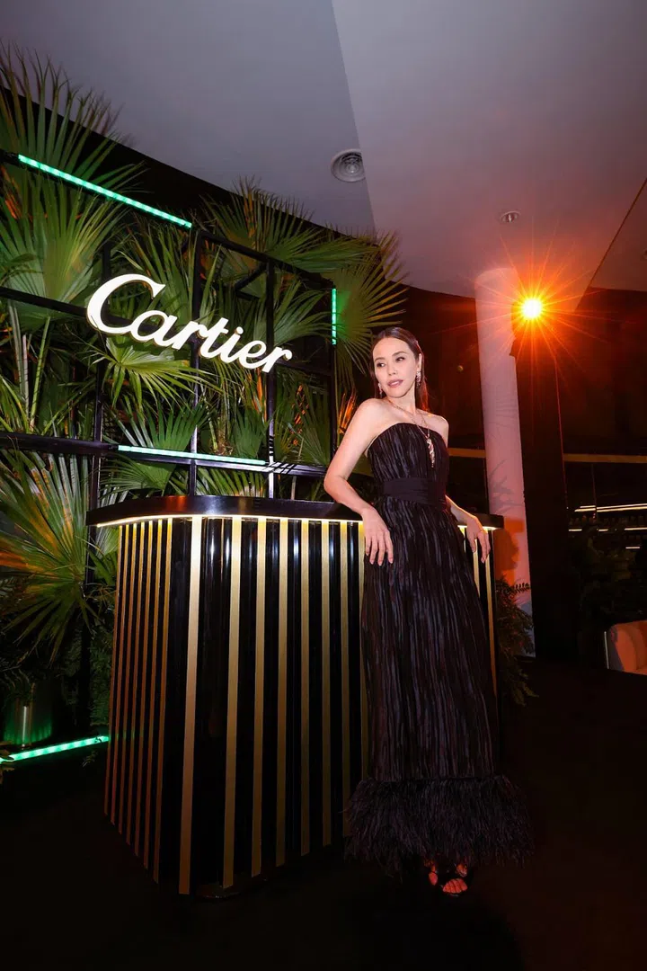 Mae Tan佩戴Indomptables de Cartie黄金镶嵌缟玛瑙、黑漆和沙弗萊石手镯、Panthère de Cartier黄金镶嵌沙弗萊石和缟玛瑙戒指、Clash de Cartier玫瑰金镶嵌缟玛瑙和钻石耳环。