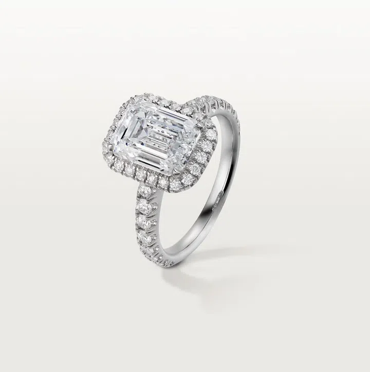 灵气十足大钻戒,在指尖闪耀着清透光芒。Cartier Destinée钻戒以单颗祖母绿形切工钻石为主角,铺镶圆形明亮式切工钻石,设计柔美和谐,绽放出让人目眩神迷的钻石光晕。