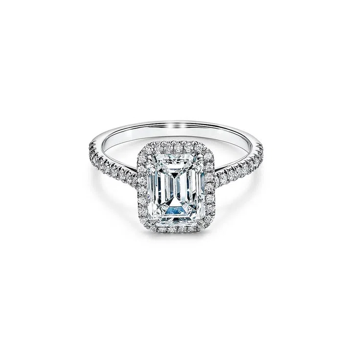 无论潮流如何变化,高贵典雅的祖母绿切工钻戒历久不衰,永远在女人心中占有一席之地。Tiffany Soleste系列的冰糖块钻戒,光芒如同骄阳般四射,夺目的祖母绿形切工主钻由珠链式边镶钻石璀璨簇拥,采用同心排列的平行刻面,营造出迷人的光晕效果。