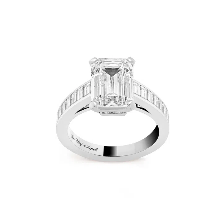 钟爱标准冰糖块钻戒的女士,怎能抗拒得了它。Van Cleef & Arpels 的Menuet钻戒镶饰着纯净迷人、经精准切工的长方形钻石,令人联想起路易十四(Louis XIV)统治时期出现的优美小步舞曲,展现当时的王室风华。