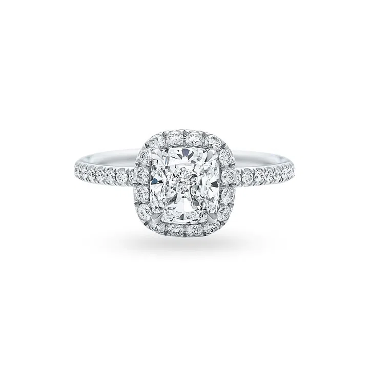 “钻石之王”Harry Winston独具匠心的经典之作,枕形切工的主钻以极细微密钉镶嵌的钻石环绕,镶嵌于同是极细微密钉镶嵌的钻石戒环上,设计精巧,柔美浪漫,散发隽永魅力,让人爱不释手。
