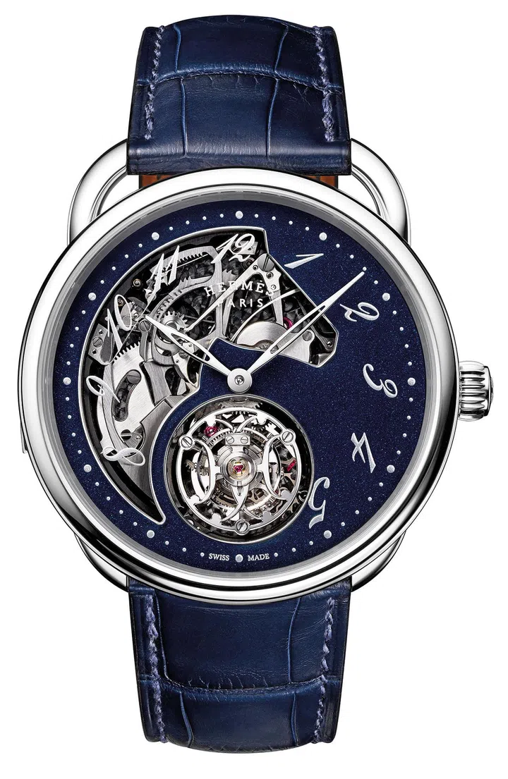在爱马仕(Hermes)全新Arceau Lift三问陀飞轮腕表的表盘上,骏马形镂空展现了品牌的陀飞轮机芯和三问报时机制。骏马造型的镂空与表壳的曲线造型相配得宜,双音色三问报时机制的细腻精密令人着迷。陀飞轮盘绕在马颈间,并在6点钟位置的圆形视窗显现。陀飞轮结构具有双H造型,其灵感源自巴黎圣特娜福宝大道爱马仕总店的标志性图案。
