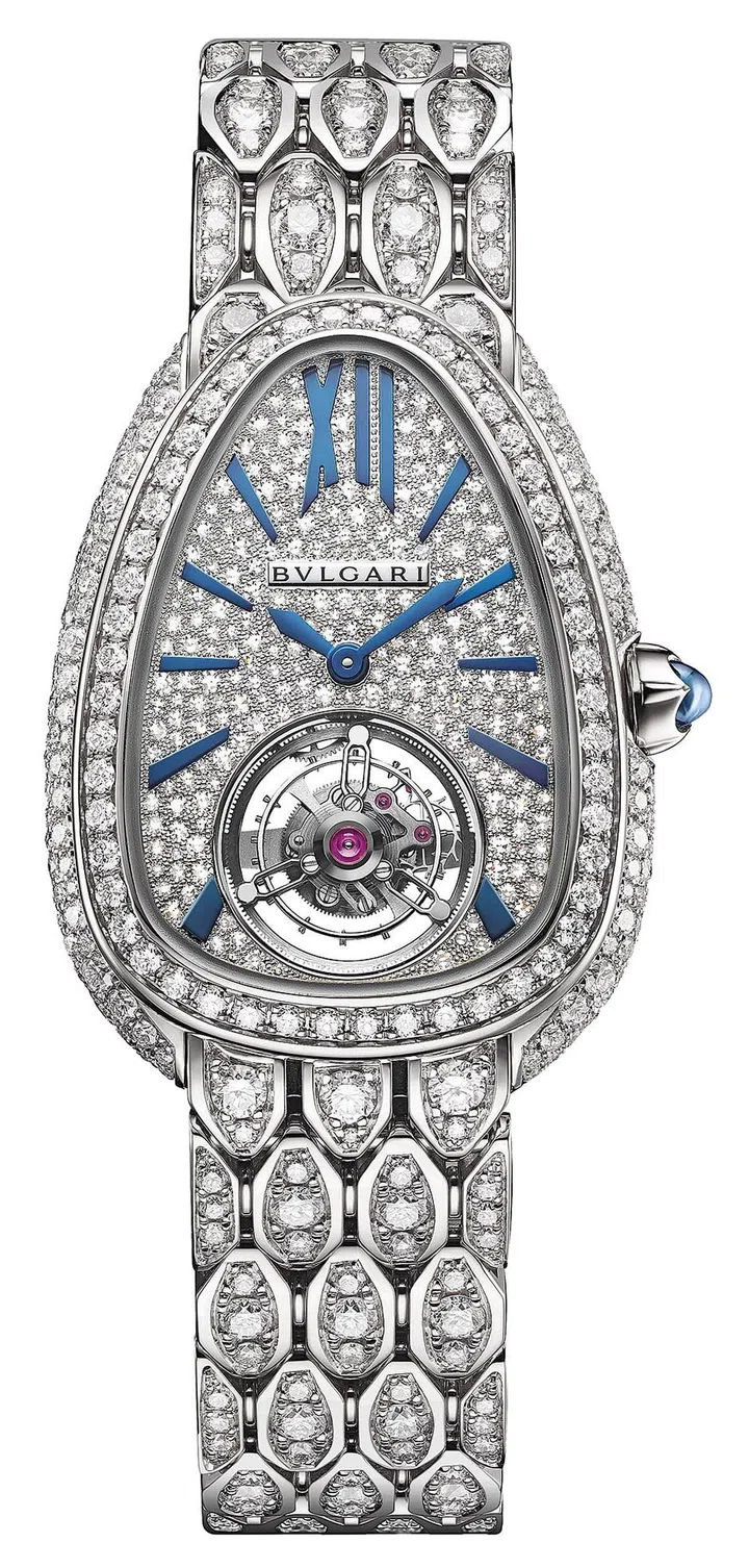 宝格丽(Bvlgari)新款Seduttori 的机芯融合了瑞士专业的制表知识与珠宝制作的卓越技艺,是品牌独具一格的特色;同时也是市面上小型陀飞轮的巅峰代表,复兴了70年代初期被石英机芯所取代的小型机械机芯传统。此款精巧的复杂腕表机芯是为了搭配Serpenti蛇首表壳而特别设计,镀铑机芯饰有手工装饰的日内瓦波纹、珍珠圆点打磨纹、手工修饰倒角,搭配蓝宝石桥板。