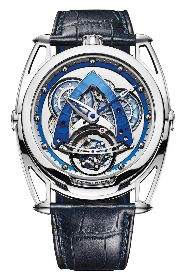 今年是De Bethune最具代表性的作品DB28问世10周年。此次品牌推出令人惊叹的DB28 Steel Wheels Saphir Tourbillon腕表,在尽可能地展示机芯的技术感和装饰外观的同时,也凭借蓝宝石的透明性为陀飞轮机制增添了复杂美感。钛合金表壳保持其标志性的独特结构设计:圆形表壳与铰接式镂空表耳联结在一起。设于6时位置的是吸引眼球的高振频陀飞轮模块,旋转周期为30秒。