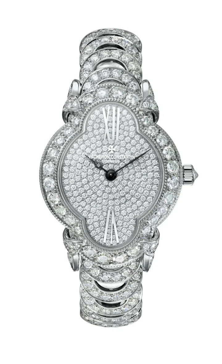 翩翩华彩,美丽绽放。江诗丹顿(Vacheron Constantin)的HEURE ROMANTIQUE罗曼时光18K白金腕表,灵感源自1916年的经典表款,致敬浪漫的美好年代(Belle Époque)和新艺术时期(Art Nouveau)。镶嵌着620颗圆形切割钻石,镶钻表链由手工组装装饰,新月形链节与波浪形的表壳线条相得益彰,柔美浪漫中带着华美古典气息。