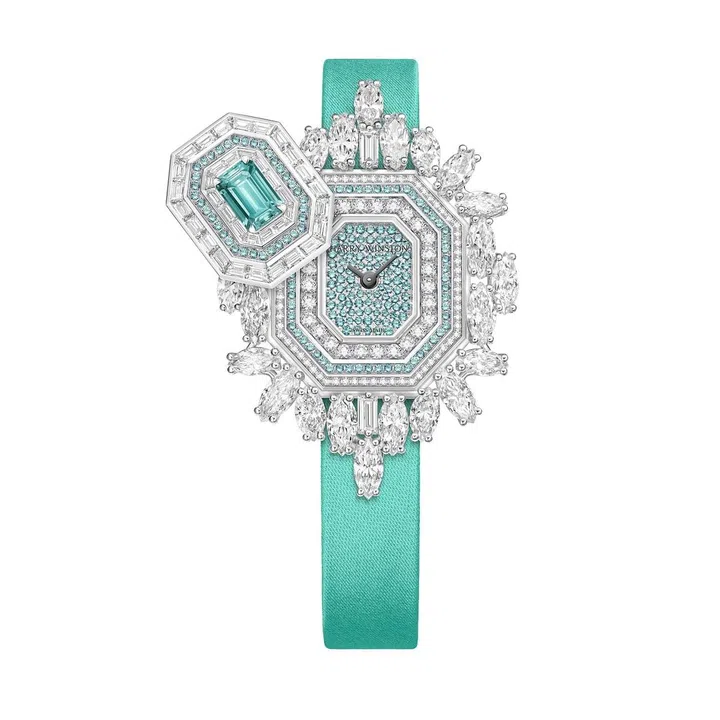 纯粹清透的绿蓝色,让人坠入幻彩世界。海瑞温斯顿(Harry Winston)高级珠宝腕表家族中最为引人瞩目的作品——Ultimate Emerald Signature腕表,以真系的帕拉伊巴色碧玺打造,于2021年底推出的全新表款。表盘结合钻石和帕拉伊巴色碧玺,错落有致呈现熠熠星芒。不仅可作为腕表配搭,还可作为坠饰或胸针,一件珠宝作品同时拥有多种时尚风貌,展现品牌对极致工艺的追求,也凸显女性的多变魅力。