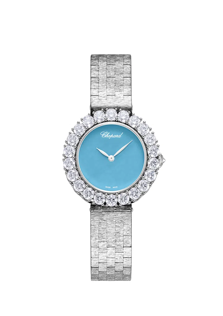 萧邦(Chopard)经典的L'Heure du Diamant腕表系列,体现出品牌精湛技艺的两大核心:制表技艺和宝石镶嵌融合的精湛工艺。这款圆形18K金小号腕表,镶嵌了22颗爪镶钻石,配搭色彩独特的绿松石色表盘,宛如湛蓝湖水般,在方寸之间构筑至美的梦幻意境。