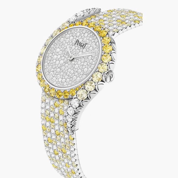 伯爵(Piaget)LIMELIGHT GALA系列高级珠宝腕表,闪烁细腻动人的光芒,表壳为18K白金材质,镶饰10颗明亮式切割美钻和32颗黄色蓝宝石,从表盘到表带也密镶了璀璨美钻,配搭伯爵自制的501P1自动上链机械机芯,全球限量发行8枚,奢雅尊贵至极。