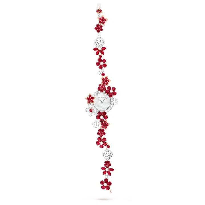 繁花盛开,春意盎然。梵克雅宝(Van Cleef & Arpels)Folie des Prés高级珠宝腕表以野生花朵为灵感,结合红宝石、钻石和珍珠母贝,通过丰富的切割琢形,演绎花卉的绮丽百态。宝石花朵朵自然衔接,彰显匠心工艺,将色彩斑斓的花簇美景永恒封存,展现茂盛蓬勃的生命力。