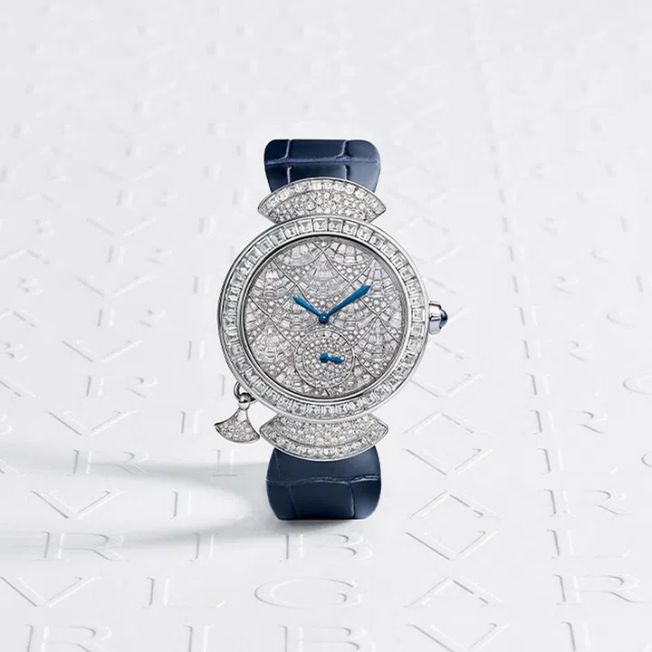宝格丽(BVLGARI)推出精益求精的优雅新作——Divas' Dream Finissima Caracalla腕表,以巧妙方式诠释系列标志性的美学元素——罗马卡拉卡拉大浴场(Caracalla Baths)的扇形马赛克图案。作为品牌最纤薄的女士三问表,密镶钻石表盘配搭蓝色鳄鱼皮表带,贵气雅致,搭载品牌开创性的自制机芯,同时隐藏着一个小秘密:侧面设有用于激活报时机制的标志性扇形装饰,凸显制表师巧夺天工的技艺。