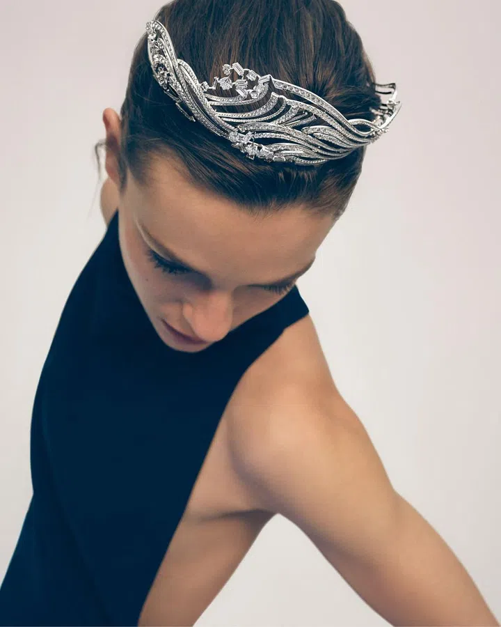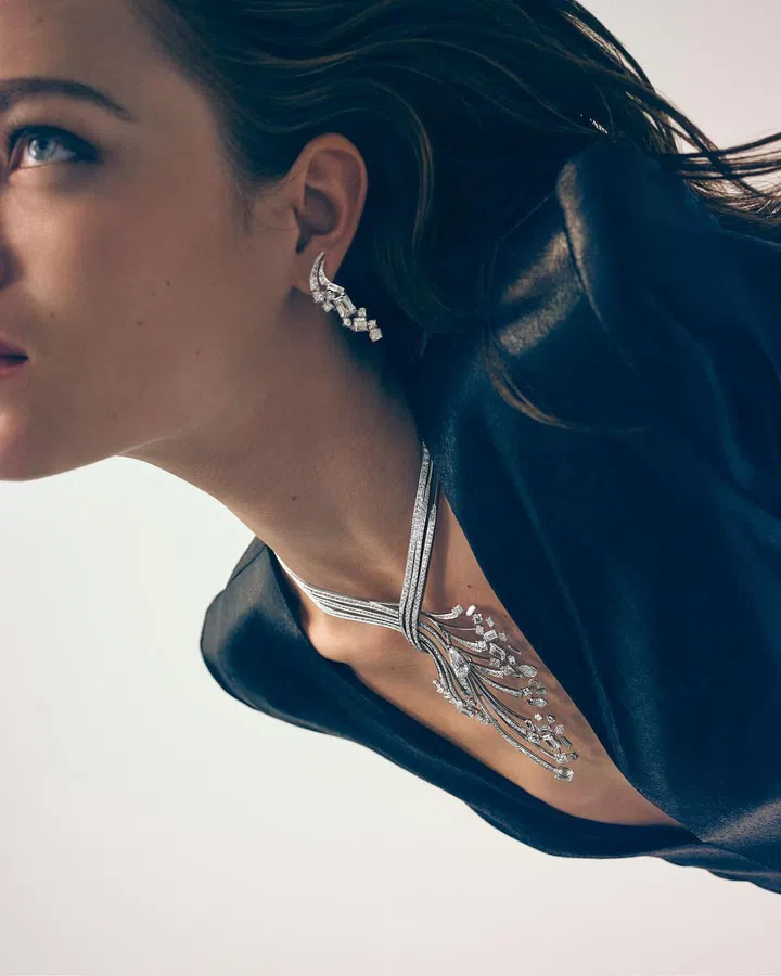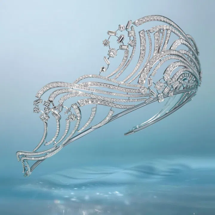 全新Déferlante de Chaumet涛澜生辉”高定珠宝套系着眼浪涛迸进时的动姿,宝石光影相映、廓形线条流转,为珠宝注入全新的动态之美,传达“水”丰沛的生命力与永流不息的能量。本次新作呈现了冠冕、可转换珠宝等尚美巴黎世家代表作及其它共8件珠宝(其中包含一件腕间珍宝),也是对先前推出的高定珠宝套系——“Torsade de Chaumet 旋爱·芳登”的扩充,进一步表达品牌对生机与动感的讴歌。
