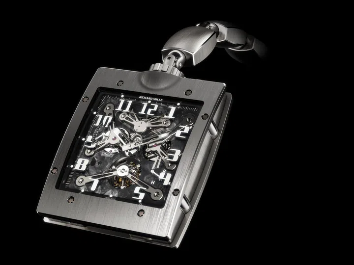 RM 020是第一款使用由碳纳纤维制成的底板的怀表。这种材料最早是用在美国空军的喷气机里。这是一种各向同性的复合材料,在7500 N/cm2的高压和2000˚C的高温下浇铸而成,具有极强的机械、物理和化学各方面稳定性。该材料适用于保证运转传动链在多变的条件和气温下的稳定性。陀飞轮擒纵机构由双上发条发条匣驱动。两个发条匣直接连接在一起,提供大约10日动力储备。