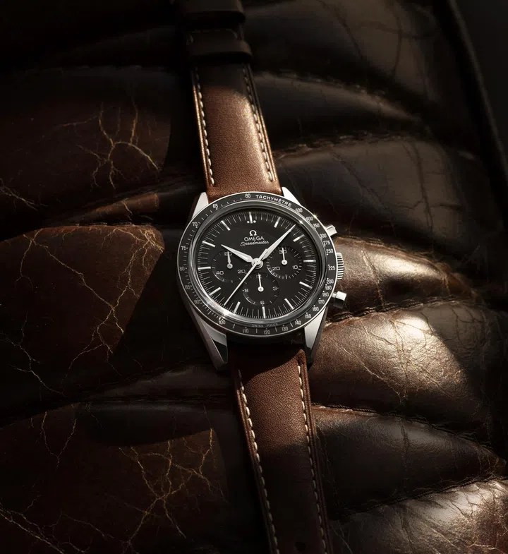 Speedmaster是欧米茄(Omega)最具代表性的表款之一。 “First Omega in Space”月球表的设计灵感源自太空人Wally Shirra于1962年所佩戴的腕表。 39.7毫米精钢表壳配置设有测速刻度的黑色表圈,衬以棕色皮表带,搭载1861机芯,这款著名的手动上链机芯曾经登上月球。