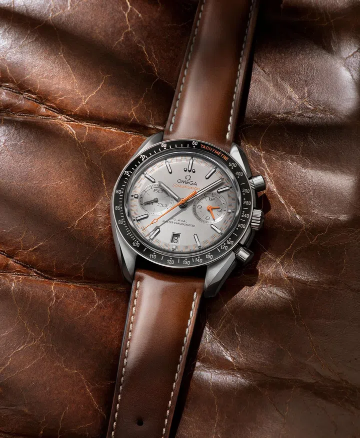 欧米茄超霸系列赛车计时至臻天文台表采用44.25毫米精钢表壳,搭配棕色皮表带,配备黑色陶瓷表圈圆环,饰以带橙色“Tachymetre”字样和Liquidmetal数字的测速刻度。太阳射线打磨灰色表盘之上设有别具一格的赛车风格分钟圈,同时也因这一独特设计而得名。两个贴镶镀铑圆环的小表盘以及6点钟位置日历窗口与表盘颜色融合一体。黑色或橙色亮漆指针及黑色箭形小时刻度均覆以白色Super-LumiNova夜光涂层。腕表搭载Omega 9900同轴至臻天文台机芯。